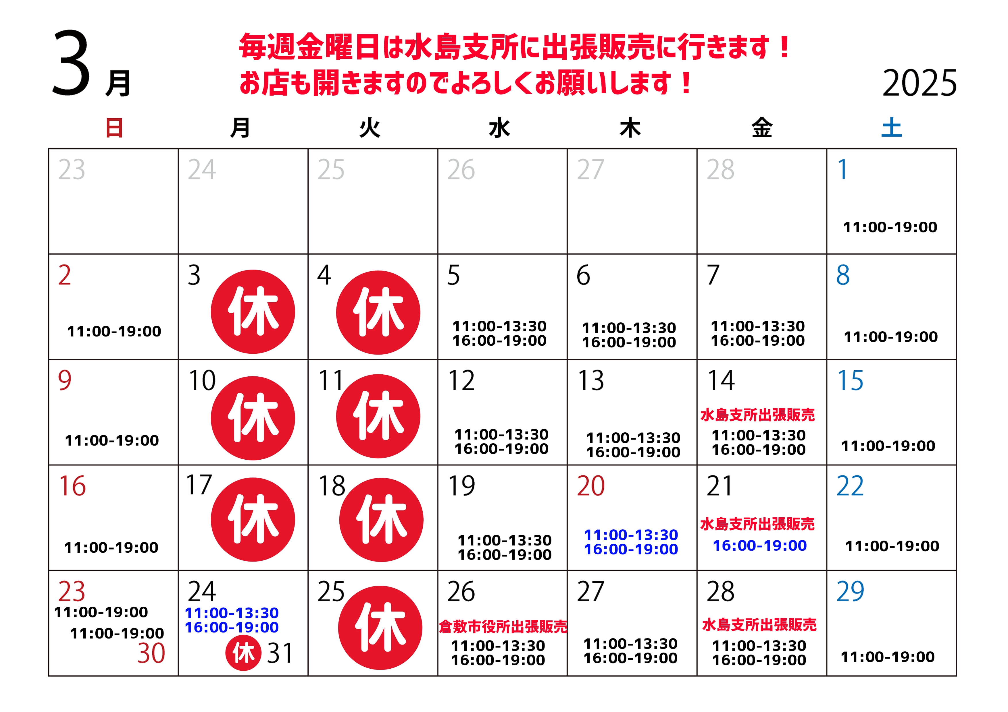 住所:岡山県倉敷市白楽町539−1 (倉敷商業高校道向かい)TEL :070−8987−0961営業日:下記の営業カレンダーをご確認ください。